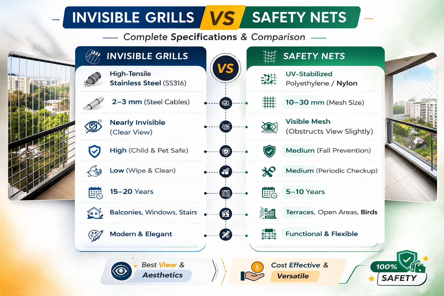 High-tensile invisible grills for balconies, windows, and open spaces.